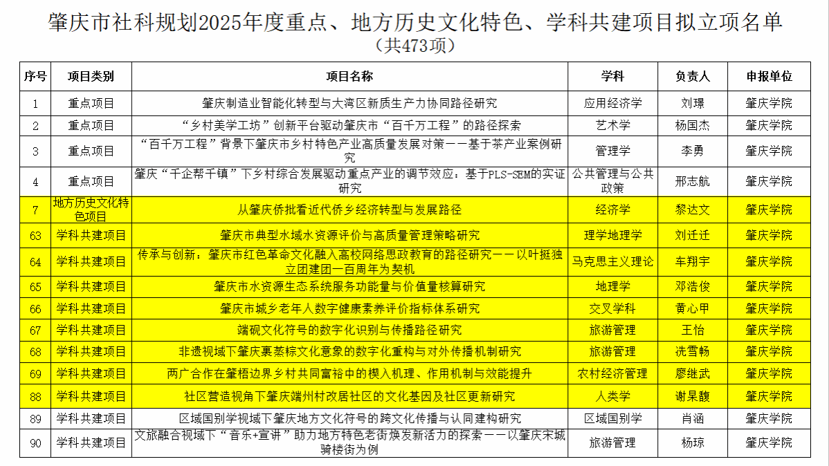 近日,肇庆市哲学社会科学规划2025年度重点、地方历史文化特色及学科共建项目拟立项名单正式公布。公司廖继武、黎达文、刘迁迁、车翔宇、邓浩俊、黄心甲、王怡、谢杲馥和冼雪畅共九位教师的科研项目成功获批立项,涵盖地方历史文化特色和学科共建两大范畴,为我市文化传承与产业发展提供了有力的理论支撑和实践指导。