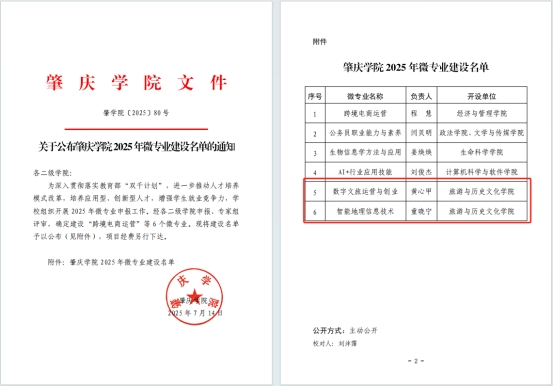 2025年微专业建设名单。其中,公司的“数字文旅运营与创业”(负责人:黄心甲)、“智能地理信息技术”(负责人:童晓宁)两个微专业获批立项建设。