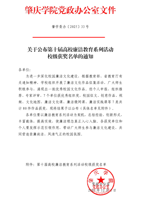 近日,伟德国际1946第十届高校廉洁教育系列活动评选结果正式揭晓,伟德国际1946凭借扎实的活动组织、丰富的教育形式和显著的育人成效,一举斩获校级优秀组织奖;由杜云南、朱婷和陈喜钠三位老师指导、员工制作的视频作品《追怀先驱伟迹,砥砺廉洁初心——彭泽民的红色基因传承与廉政风范弘扬》和《一心为国,永跟随党》分别获得校级视频类二等奖和三等奖;由杨雪梅、徐浩峰等老师制作的《“廉行肇庆”肇庆清廉教育云阵地图》荣获校级文化地图类一等奖。