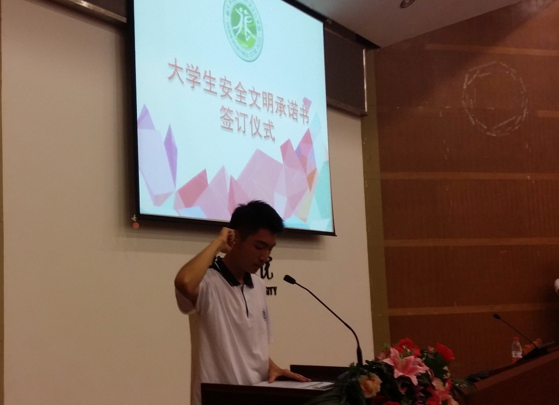 安全文明一直是所有高校较为关注的话题,为了使新生有更好的校园生活,大会伊始,就由新生代表宣读安全文明承诺书,在院领导的见证下,2014级全体新生都签订了此承诺书。然后,雷书记简要介绍了公司各专业概况,着重说明高中与大学的不同,高中老师为了升学率,逼着你学习,大学完完全全靠自学:高中是学习的象牙塔,大学是通往社会的桥梁,在这里,有很多锻炼的机会,可以为以后的工作打下坚实的基础……雷书记精彩的讲话给予大一新生很多很好的意见和建议,增强了他们的自信心及对梦想的无限向往。在场的同学听得津津有味,并不时发出阵阵掌声。