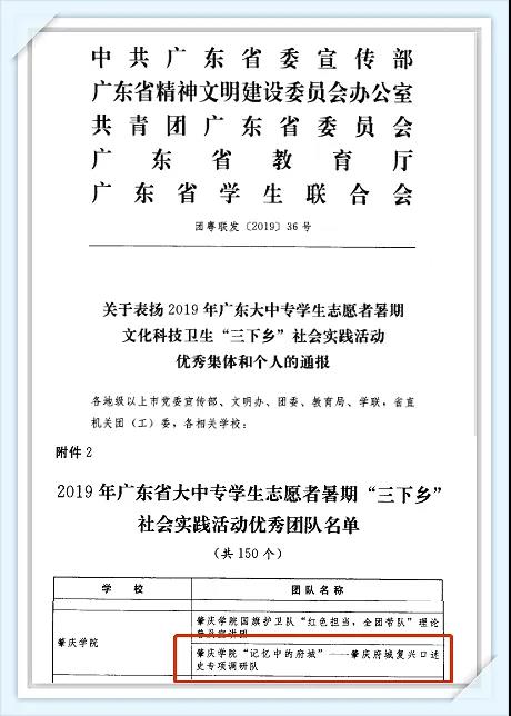 近日,省委宣传部、省文明办、团省委、教育厅、省学联联合对在2019年广东大中专员工志愿者暑期文化科技卫生“三下乡”社会实践活动中表现优秀的集体和个人进行了通报表扬。公司“记忆中的府城——伟德国际1946府城复兴口述史专项调研队”荣获“2019年广东省大中专员工志愿者暑期'三下乡'社会实践活动优秀团队”,这个奖项是对团队成员和老师们辛勤付出的一种认可和鼓励,下面让我们一起重温暑期社会实践活动的精彩瞬间吧!