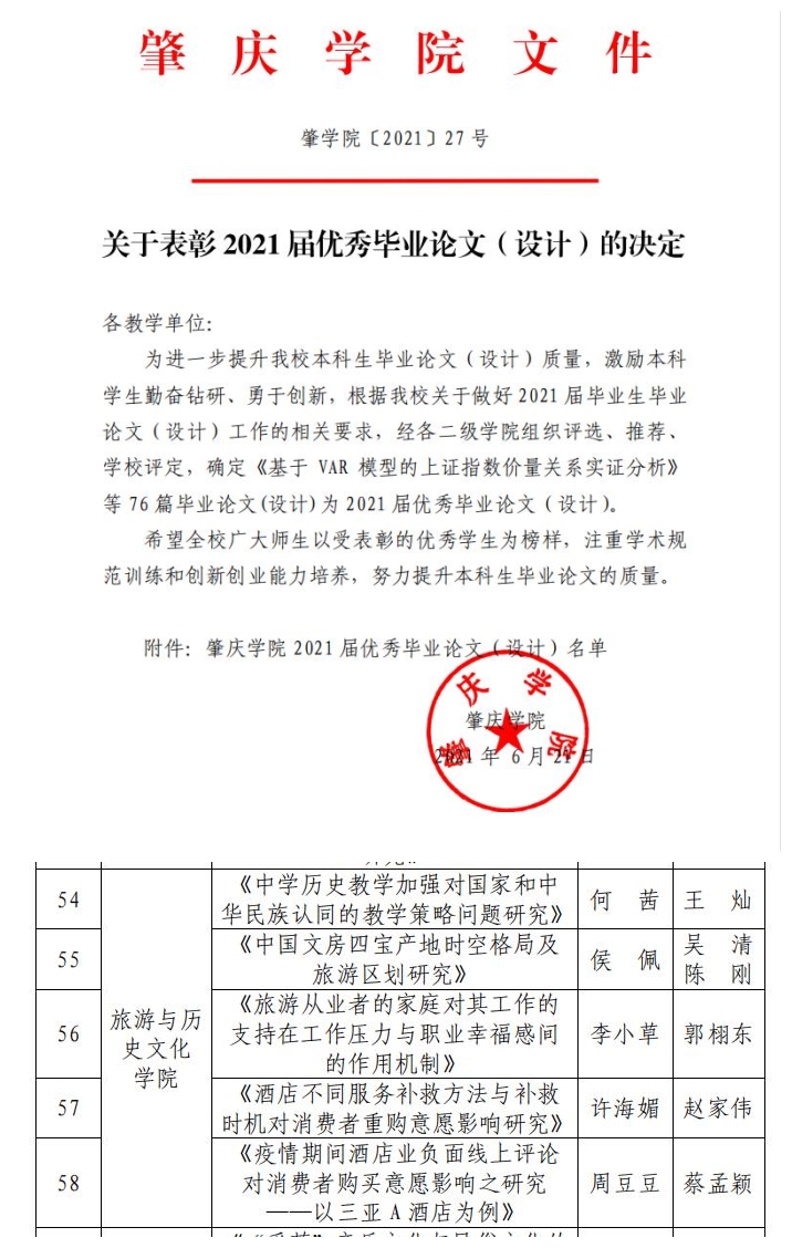 近日,在公司公布的《关于表彰2021届优秀毕业论文(设计)的决定》中,公司推荐的《中学历史教学加强对国家和中华民族认同的教学策略问题研究》等五篇论文被评为优秀毕业论文,具体名单如下: