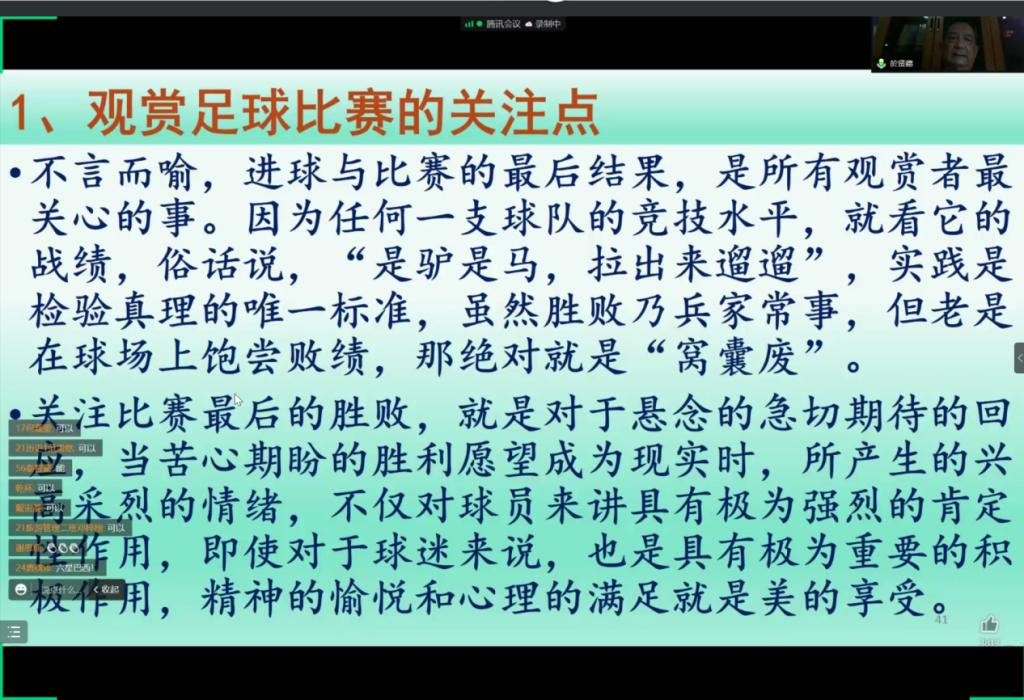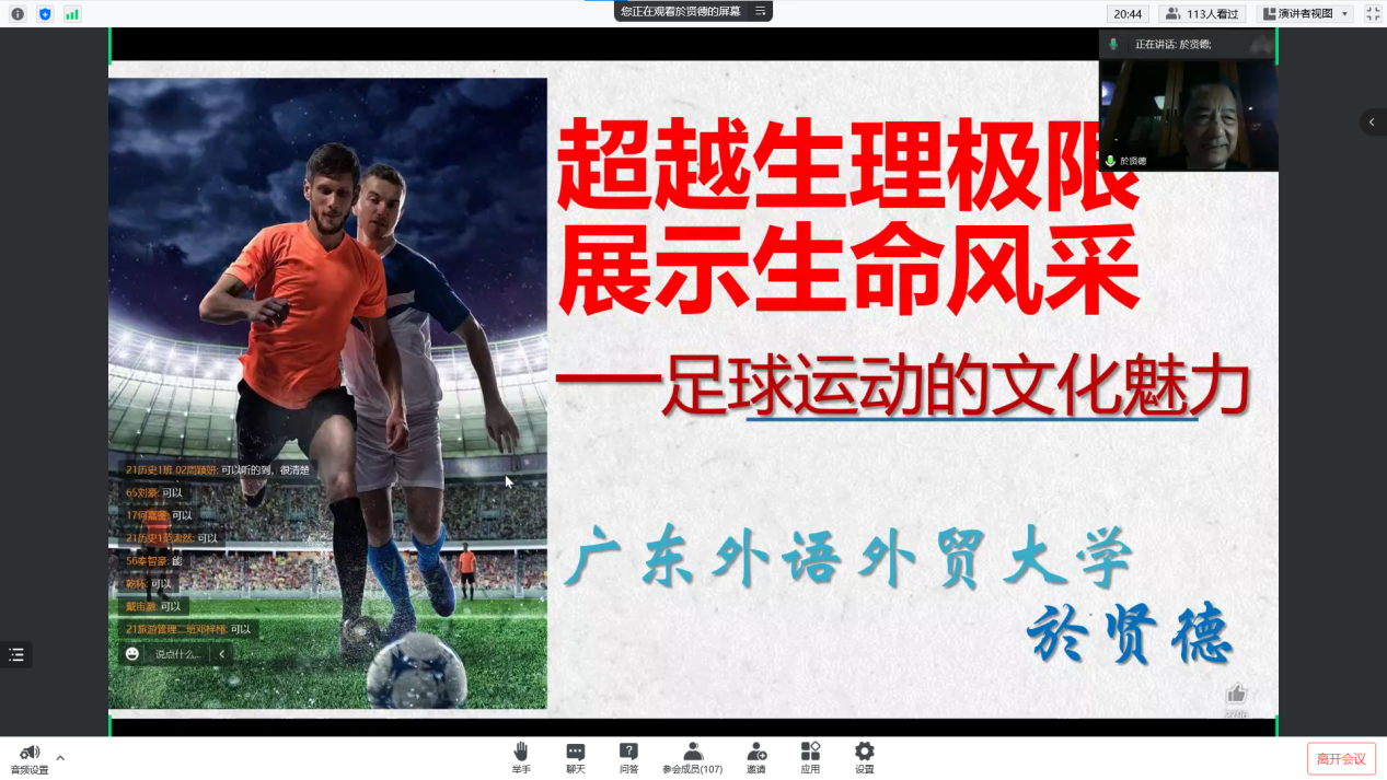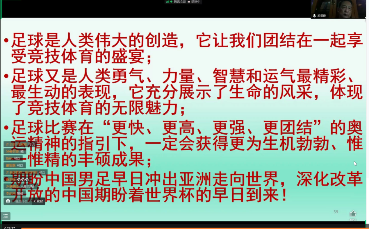 为保障疫情期间在校员工的身心健康,丰富员工课余文化生活,让广老员工在体育文化中享受乐趣,培养同学们热爱运动的习惯,帮助员工树立积极的心态,充分发挥体育运动在校园抗击疫情中的作用。11月30日,伟德国际1946文旅讲坛(第83讲)于线上开讲。於贤德教授以《超越生理极限,展示生命风采——足球运动的文化魅力》为题向公司师生讲述了足球文化中蕴含的魅力,并提出了更好地欣赏足球的建议。党委书记杨雪梅、分团委书记朱婷,21历史1班全体同学及员工代表共计120余人参加,线上讲座由刘晓聪博士主持。