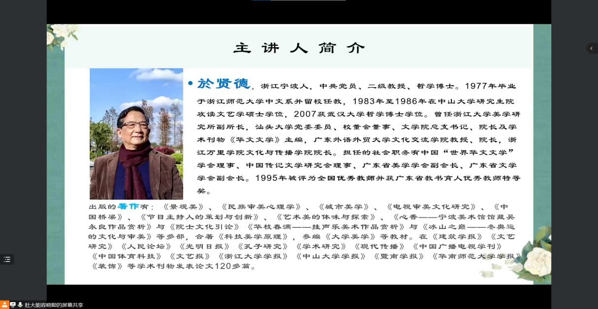 於贤德教授,武汉大学哲学博士,广东外语外贸大学文化交流公司教授、经理,中国“世界华文文学”学会理事、中国传记文学研究会理事,广东省美学学会副会长,广东省文学学会副会长。出版专著十余部,发表学术论文一百二十多篇。