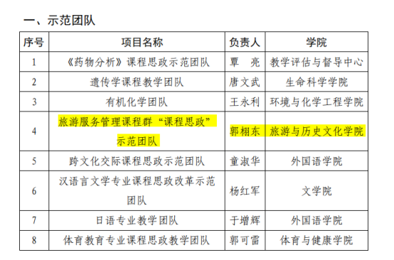 示范团队1项:郭栩东(负责人)《旅游服务管理课程群“课程思政”示范团队》。