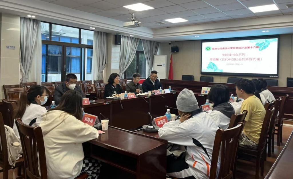 刘晓聪博士主持读书分享会。他首先就本次读书分享会主题——陈旭麓先生专著《近代中国社会的新陈代谢》进行简要陈述,接着莫尹童、李泳棋等八位同学分别就各自阅读的章节畅谈了自己的阅读心得和体会。