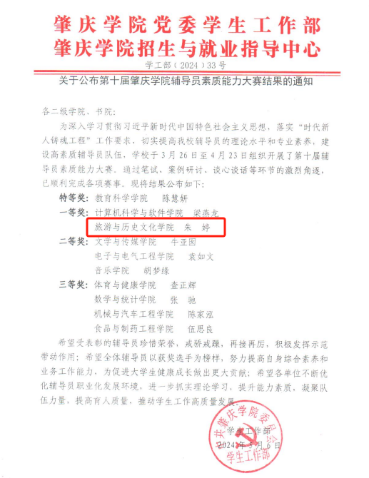 为深入学习贯彻习近平新时代中国特色社会主义思想,落实“时代新人铸魂工程”工作要求,切实提高公司辅导员的理论水平和专业素养,建设高素质辅导员队伍,公司于3月26日至4月23日组织开展了第十届辅导员素质能力大赛。通过笔试、案例研讨、谈心谈话等环节的激烈角逐,已顺利完成各项赛事。其中,公司辅导员朱婷老师喜获一等奖!