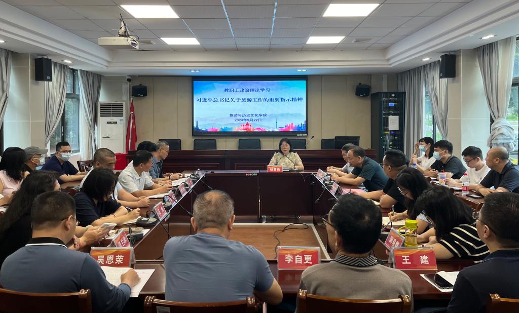 杨雪梅领学习近平总书记关于旅游工作的重要指示精神。她表示,我们要把深入学习贯彻习近平总书记重要指示和关于旅游发展的一系列重要论述作为当前和今后一个时期的重要政治任务,在全院掀起学习热潮。要将贯彻全国旅游发展大会精神和做好立德树人工作贯通起来,持续推动校地合作和产学研工作,助力“百千万工程”;进一步建设文旅产业公司,着力推动旅游管理数字化转型。要把学习成果转化为干事创业的强大动力,运用到科研工作中,落实到社会服务中,体现在人才培养成果中,以旅院力量推动建设旅游强国。