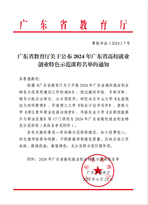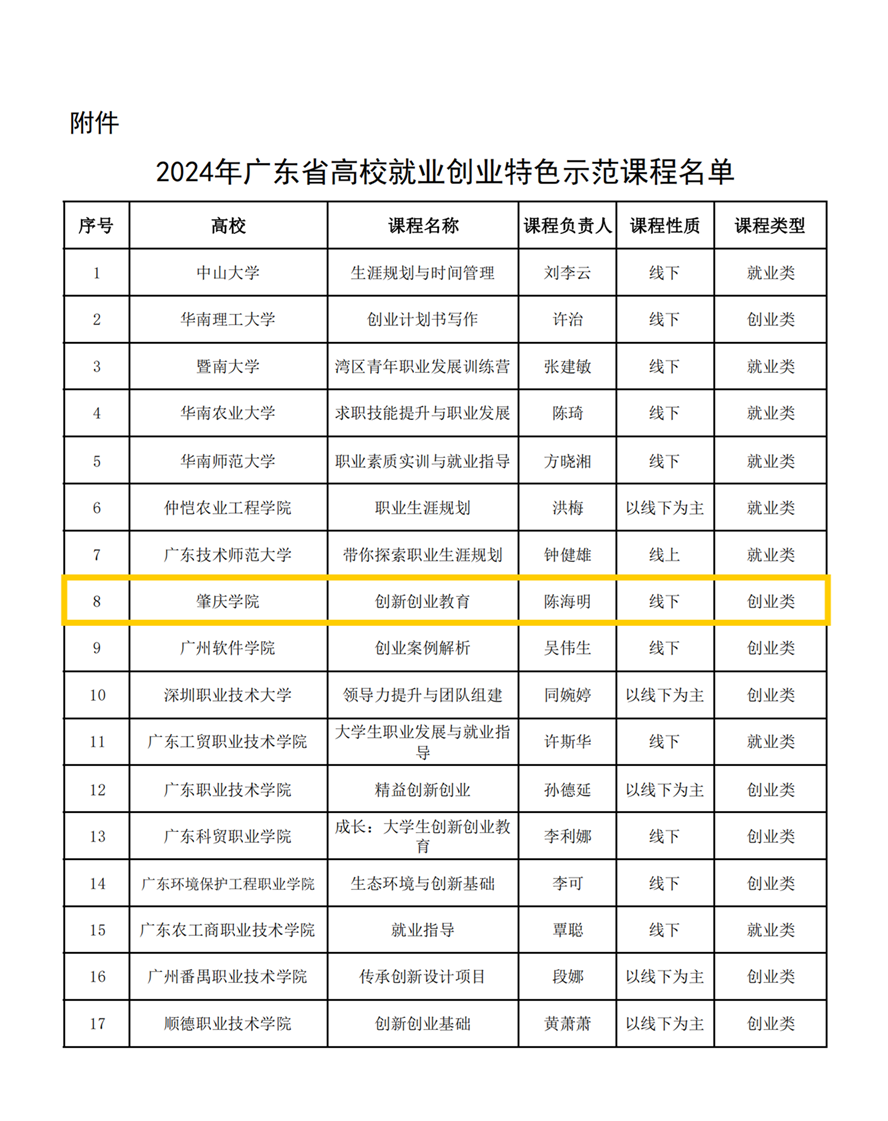 近日,广东省教育厅公布了2024年广东省高校就业创业特色示范课程名单。公司陈海明副教授的创业类线下课程《创新创业教育》位列其中。