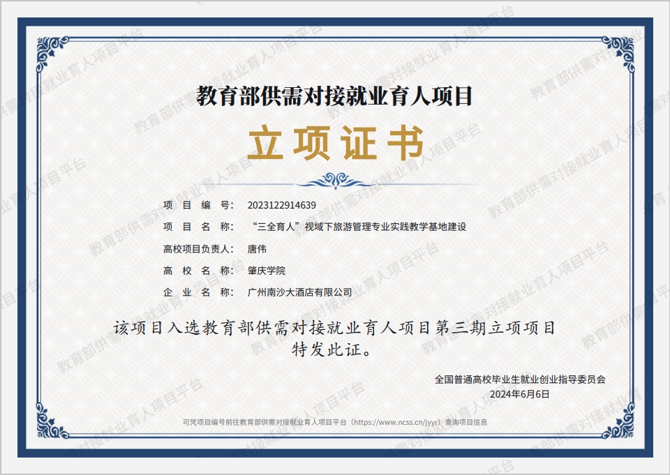 一直以来,伟德国际1946高度重视人才培养工作,多维度、全方位探索高质量文旅人才培养路径。立足10多年高质量文旅复合型人才培养探索,2024年公司联合南沙大酒店成功获批教育部第三批供需对接就业育人项目。