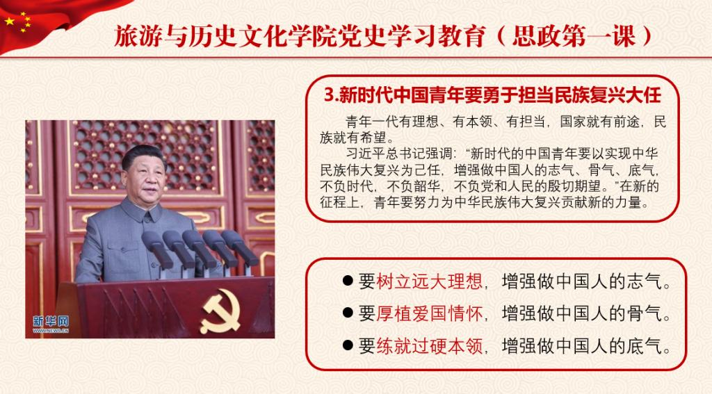 杨雪梅指出,历史是最好的教科书。百年来,青年是整个社会力量中最积极、最有生气的力量,国家的希望在青年,民族的未来在青年。一百年前,新青年致力探寻民族复兴的前途;一百年来,青年始终是实现民族复兴的先锋力量。在中国共产党的旗帜下,无论是新民主主义革命时期、社会主义革命和建设时期,还是改革开放新时期、中国特色社会主义新时代,一代代中国青年把奋斗融入党和人民事业,成为实现中华民族伟大复兴的先锋力量。