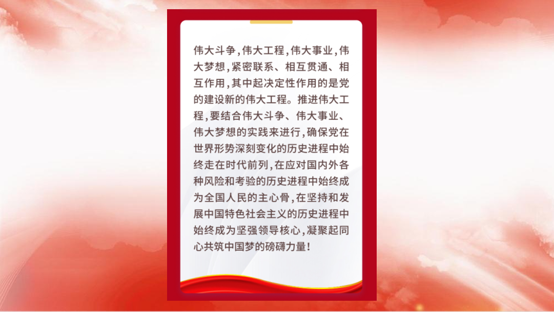 文章指出,伟大斗争,伟大工程,伟大事业,伟大梦想,紧密联系、相互贯通、相互作用,其中起决定性作用的是党的建设新的伟大工程。推进伟大工程,要结合伟大斗争、伟大事业、伟大梦想的实践来进行,确保党在世界形势深刻变化的历史进程中始终走在时代前列,在应对国内外各种风险和考验的历史进程中始终成为全国人民的主心骨,在坚持和发展中国特色社会主义的历史进程中始终成为坚强领导核心,凝聚起同心共筑中国梦的磅礴力量!