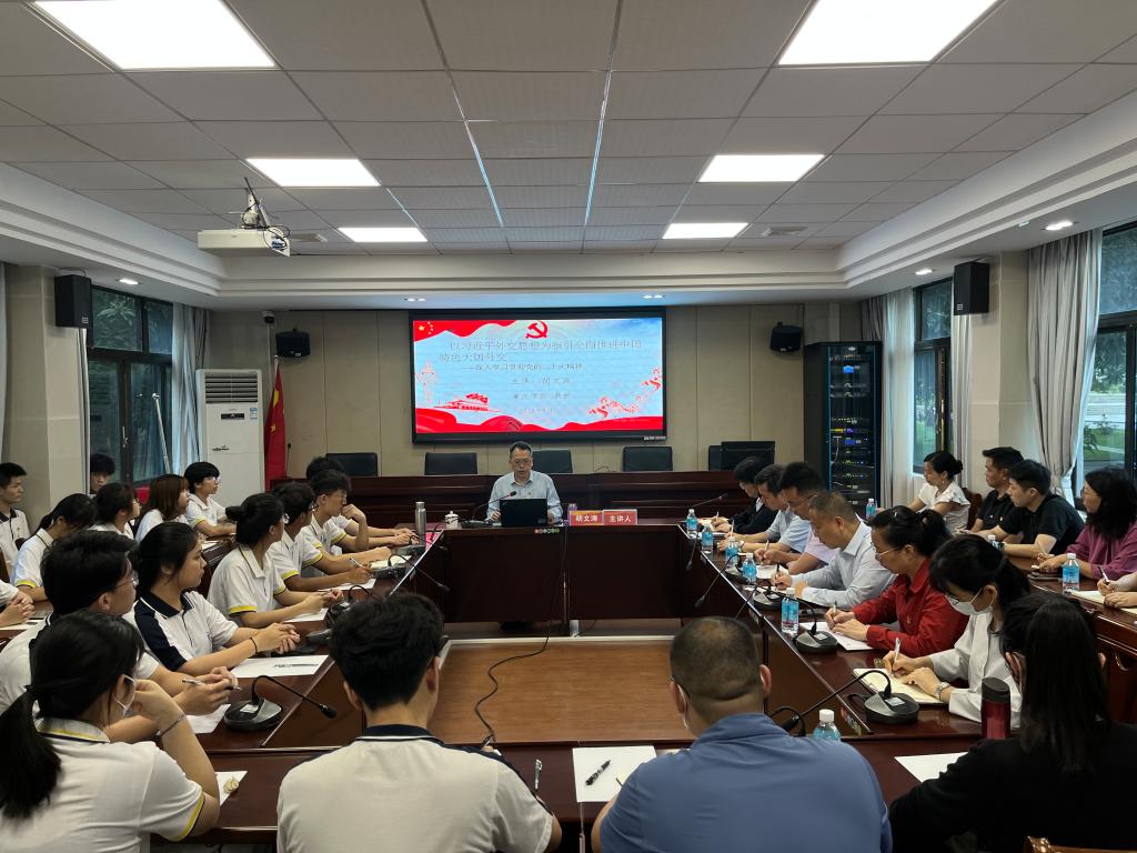 胡文涛介绍了党的二十大报告关于十年外交工作的总结,表示要以习近平外交思想为指导,努力开创中国特色大国外交新局面,为全面建设社会主义现代化国家营造良好的外部环境:一要深刻领悟习近平外交思想坚持独立自主,捍卫国际公平正义的使命意识;二要深刻领悟习近平外交思想引领外交工作的实践意义;三要深刻领悟习近平外交思想与时俱进、守正创新的理论品格;四要深刻领悟习近平外交思想坚持胸怀天下,推动构建人类命运共同体的世界意义。