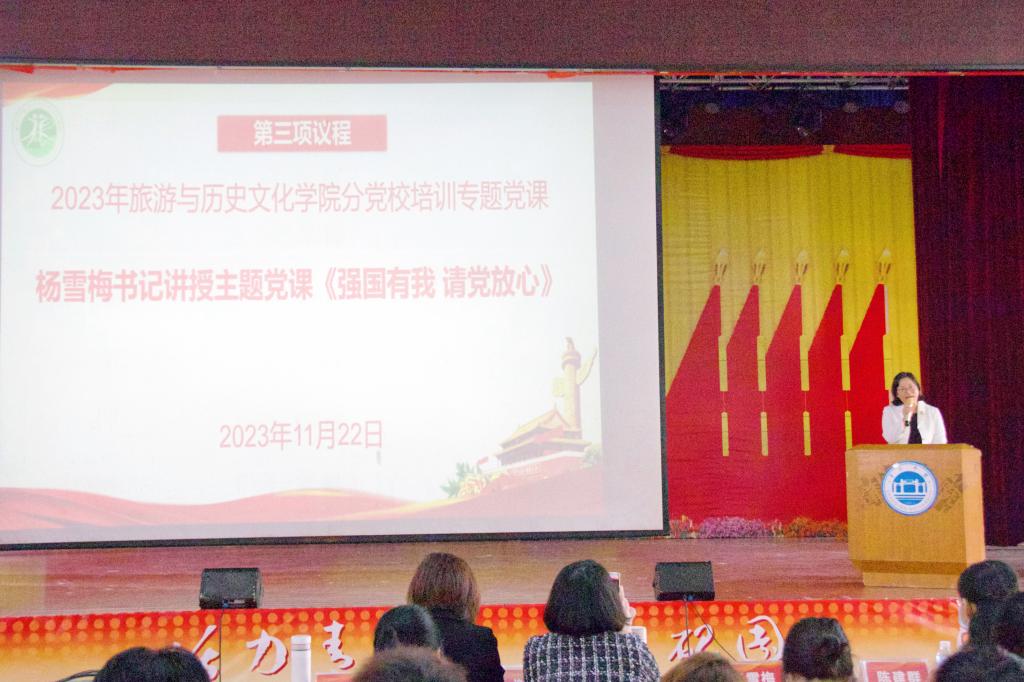 杨雪梅从“百年未有之大变局”出发,分别就“历史与现实”“解读党的二十大报告”“当代老员工的责任”等方面进行阐述。整场讲座回顾历史,映照现实,结合党的二十大报告,阐释了建设中国特色社会主义市场经济、中国式现代化、共产主义社会的深远意义。她鼓励同学们立大志、明大德、成大才、担大任,在担当中历练,在尽责中成长,让青春在不懈奋斗中绽放绚丽之花,努力成为德智体美劳全面发展的社会主义建设者和接班人。