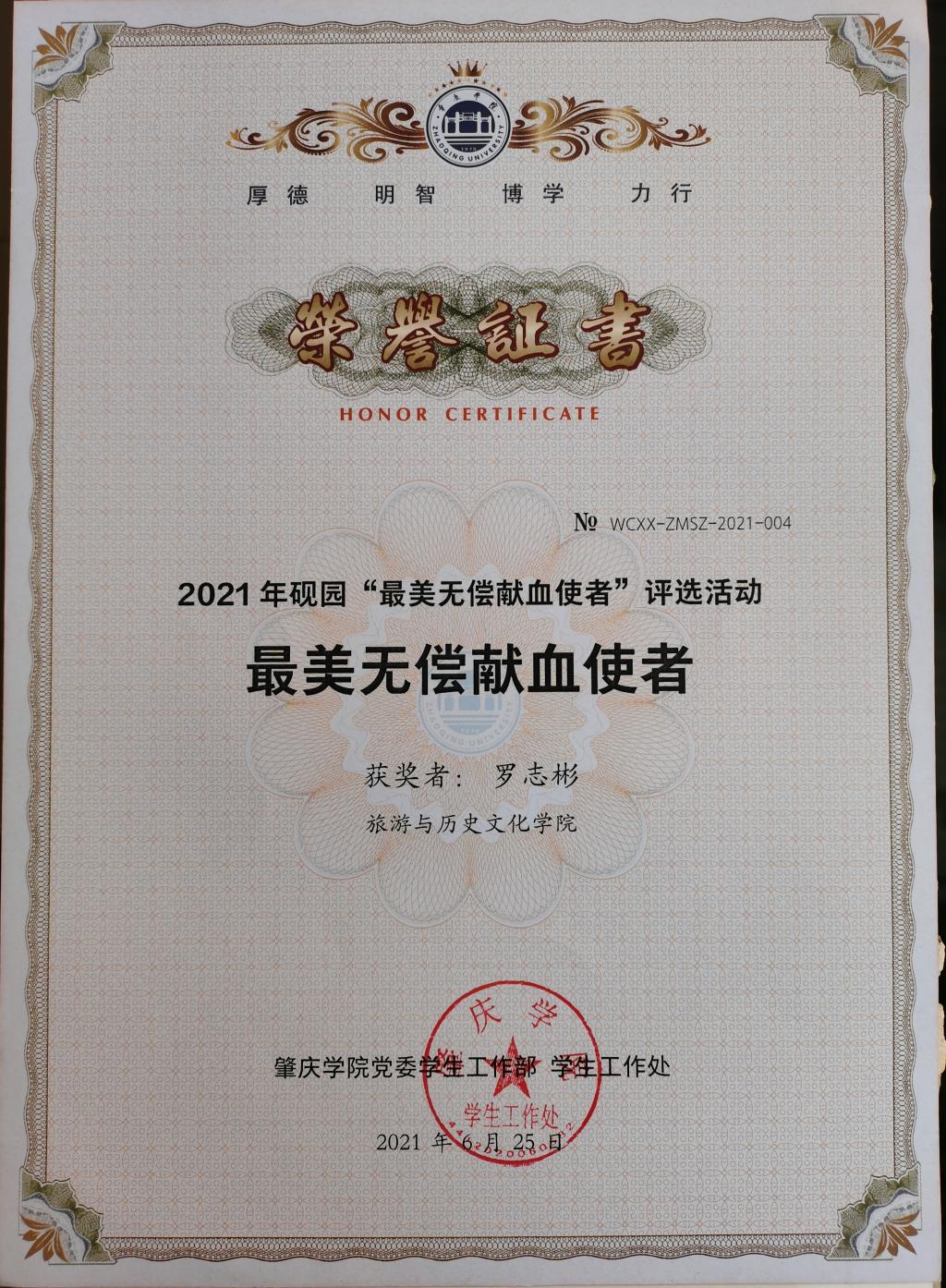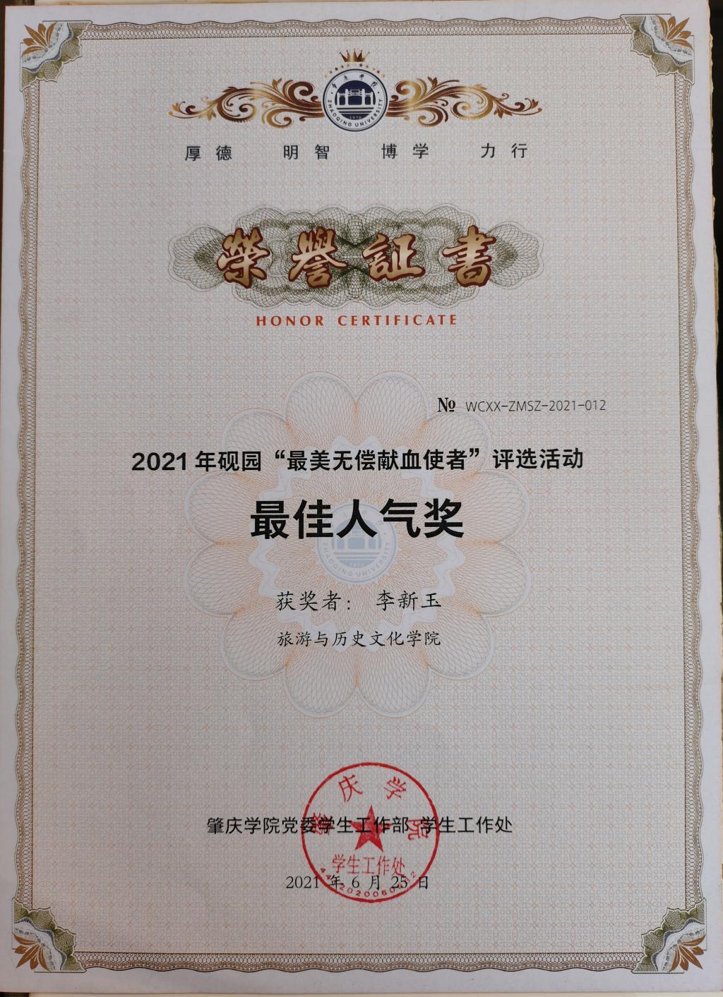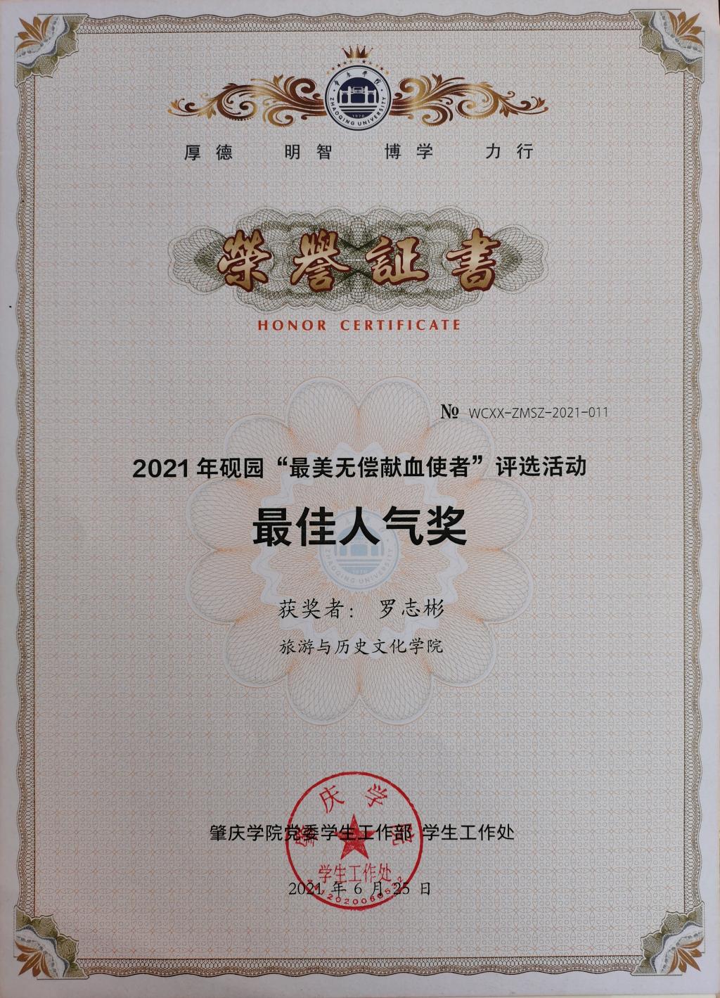 公司李新玉同学在2021年砚园“最美无偿献血使者”评选活动中获得最佳人气奖,罗志彬同学在2021年砚园“最美无偿献血使者”评选活动中获得最佳人气奖及最美无偿献血使者称号。