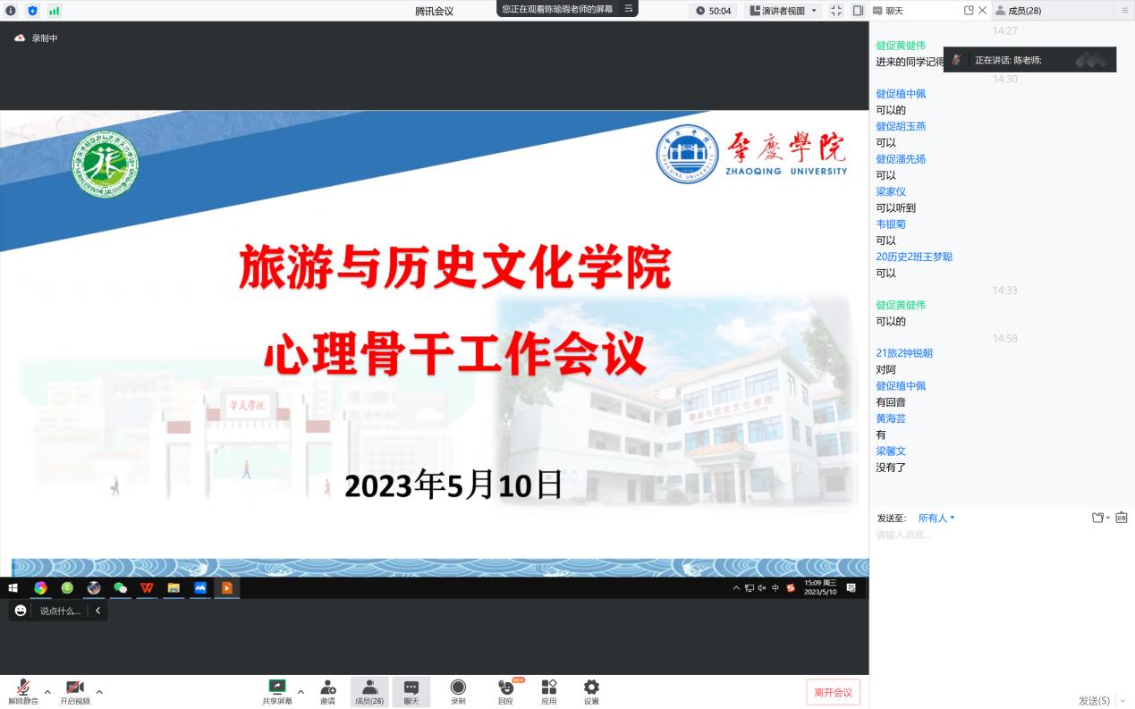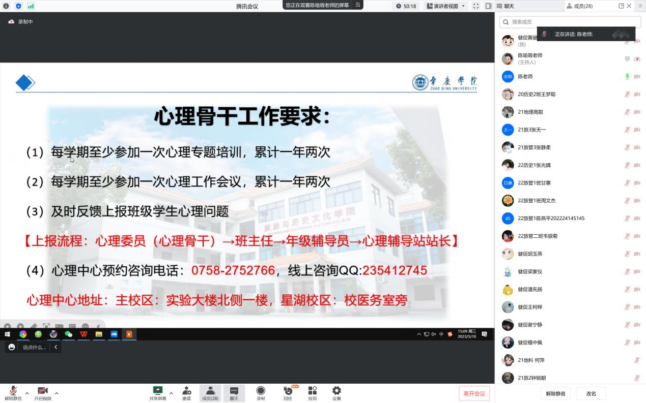会上陈瑜瑕老师与班级心理委员、心理骨干就以工作职责、工作范围、心理问题识别、问题上报流程做深入交流,解答疑惑,以便心理员工骨干很好发现及应对员工可能存在的心理问题。